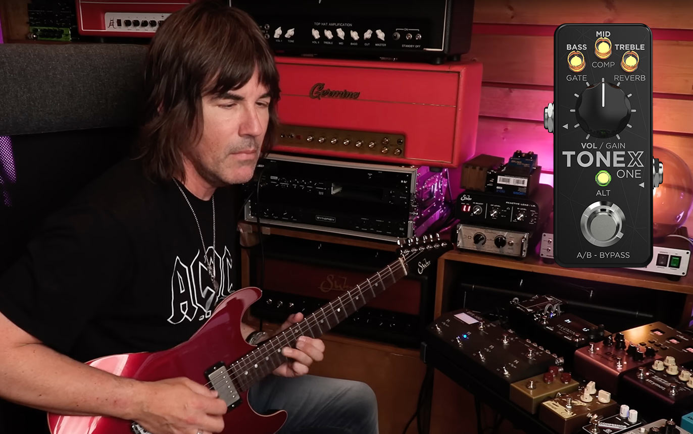 I've got a TONEX ONE here as well. You can put the sounds of different overdrives, boosts, or distortions into this little pedal or even full-on amplifier and speaker cabinet microphone captures.