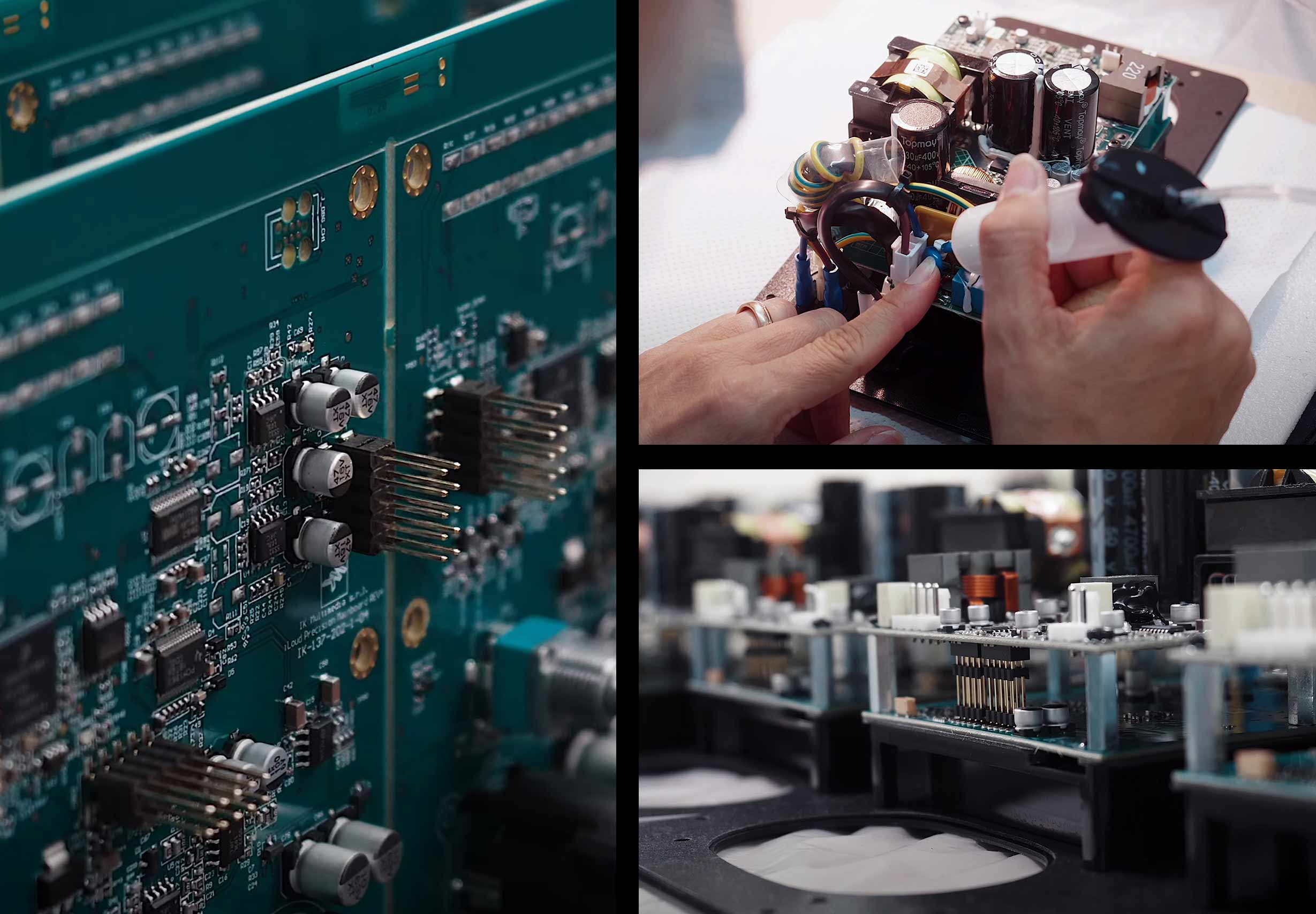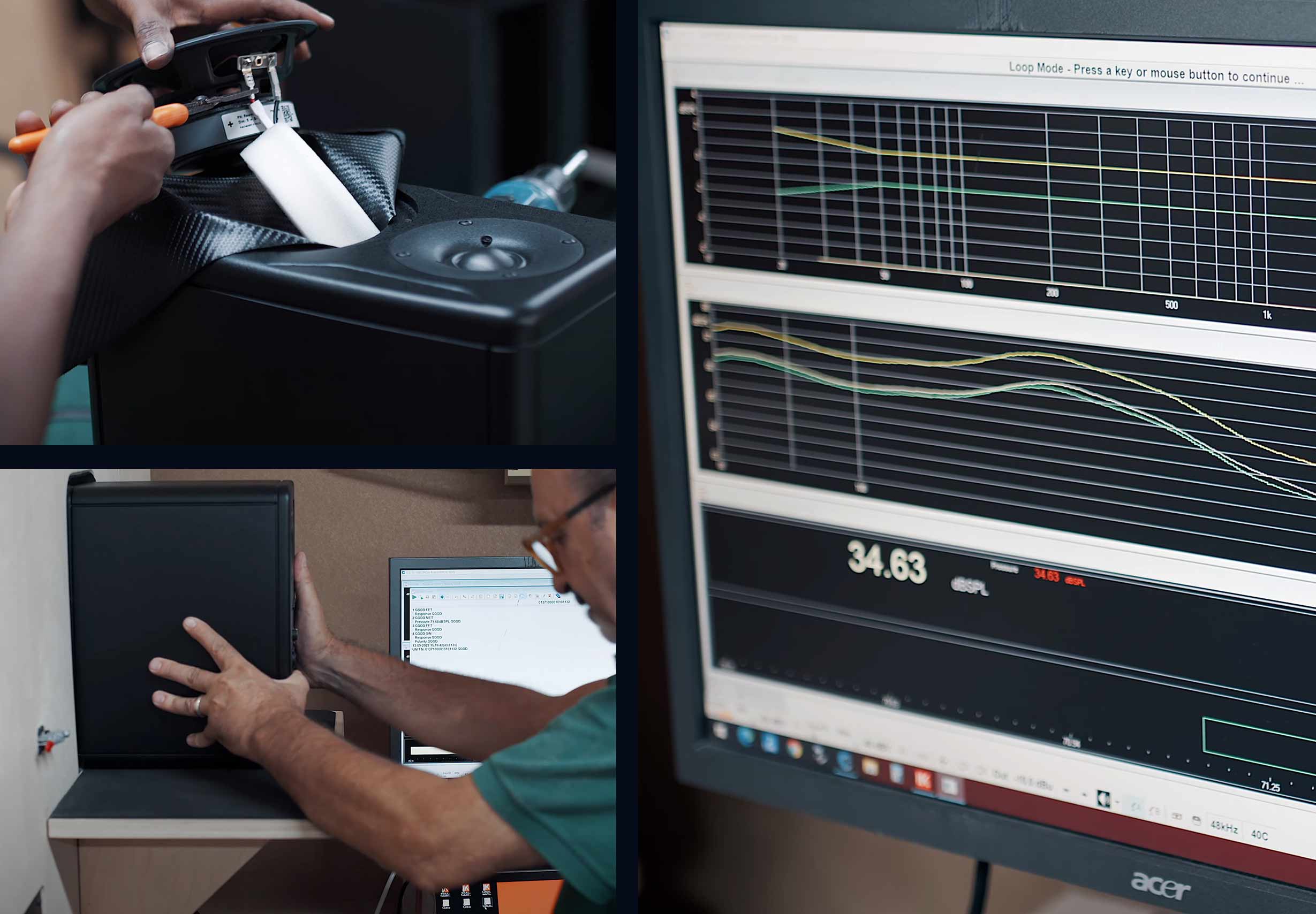Before being assembled, each cabinet, speaker and panel is tested again for potential defects. Final assembly is done completely by hand, including mounting the speaker drivers, mounting front LEDs and mounting the back panel to complete the unit.