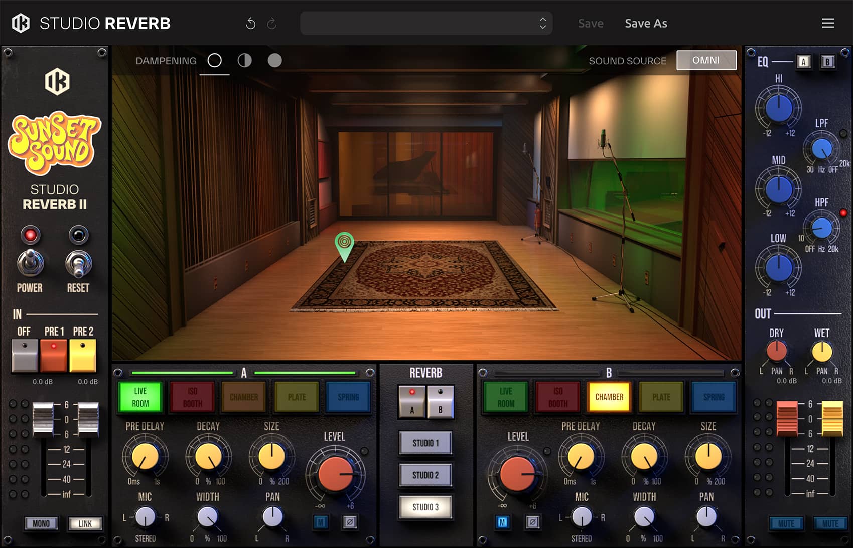 Dampening: simulates the acoustic effect of sound-absorbing panels in Studios 1 and 3, with three levels (Off, Half, Full) that progressively reduce room reflections from bright and lively to dry and controlled.