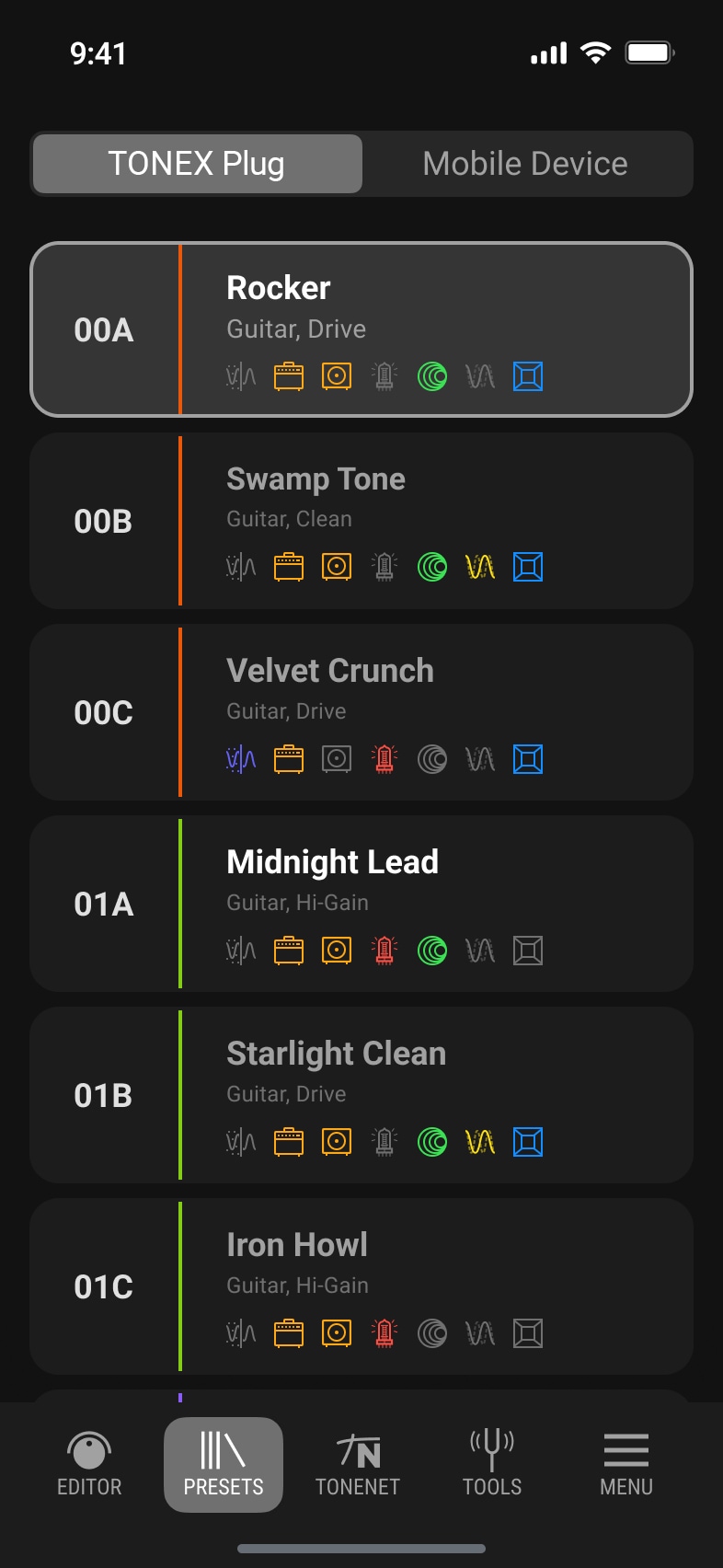 The TONEX Control app for iOS and Android serves as your wireless command center for TONEX Plug, providing full real-time control over all parameters. Easily browse and load Tone Models from ToneNET. Edit the amp, cab, EQ, IRs, and effects with precision, and save your changes directly to the hardware.