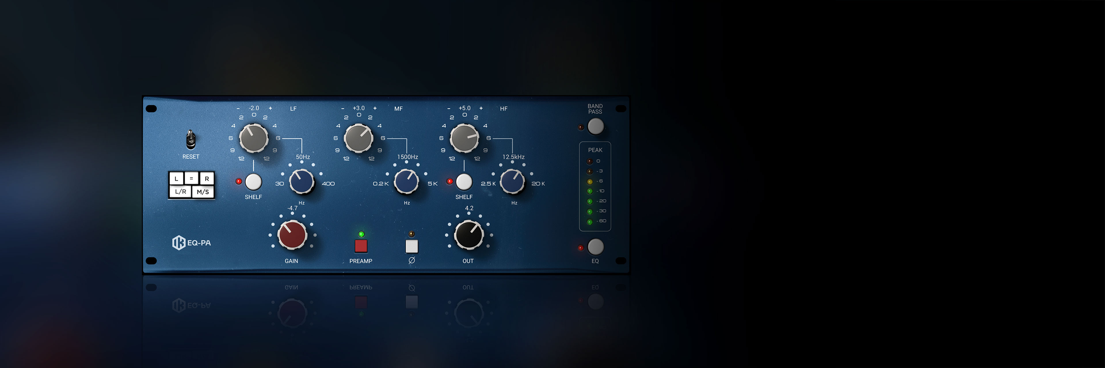Switching the outer bands from peaking to shelving mode is the key to achieve super fat low end on kick drums and bring out the "punch" when boosting in the 40 to 50 Hz zone; going as high as 10 to 15KHz will lift the airy top end on acoustic guitars or vocals while still retaining all of the analog character this EQ is world renowned for. Particular care was taken to make sure the proportional Q design and EQ curves were closely matched so that the boost or cut is broader at lower amounts of gain and gets sharper as the level is increased — an additional switchable "band pass" filter, achieved with the combination of high and low pass filters, rounds out the pack.