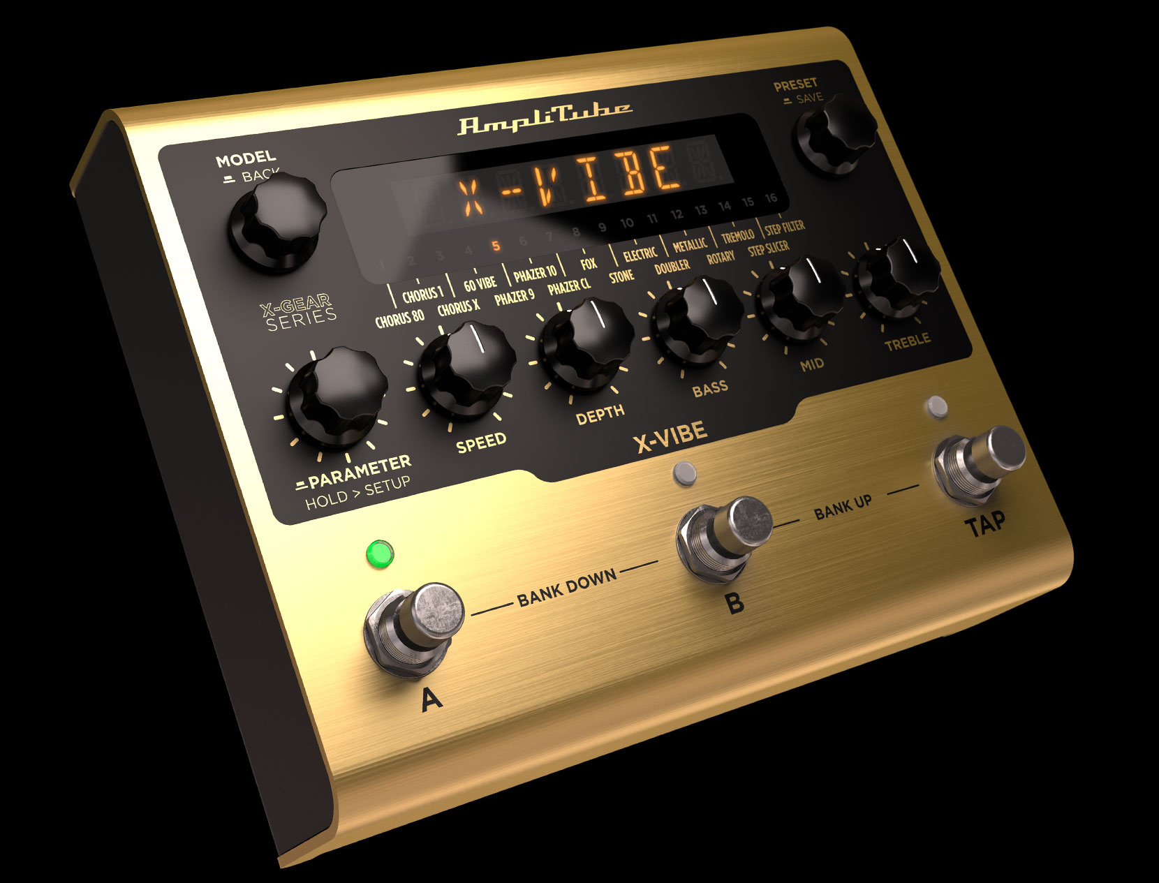 AmpliTube X-VIBE leverages IK’s latest technologies for hyper-realistic emulations of real-world gear. The state-of-the-art DSP onboard offers 16 high-end algorithms, while a special X-MODE opens additional hyper-modulation effects. All combined, X-VIBE delivers amazing clarity to the stage with the realism and response that users love about AmpliTube 5.